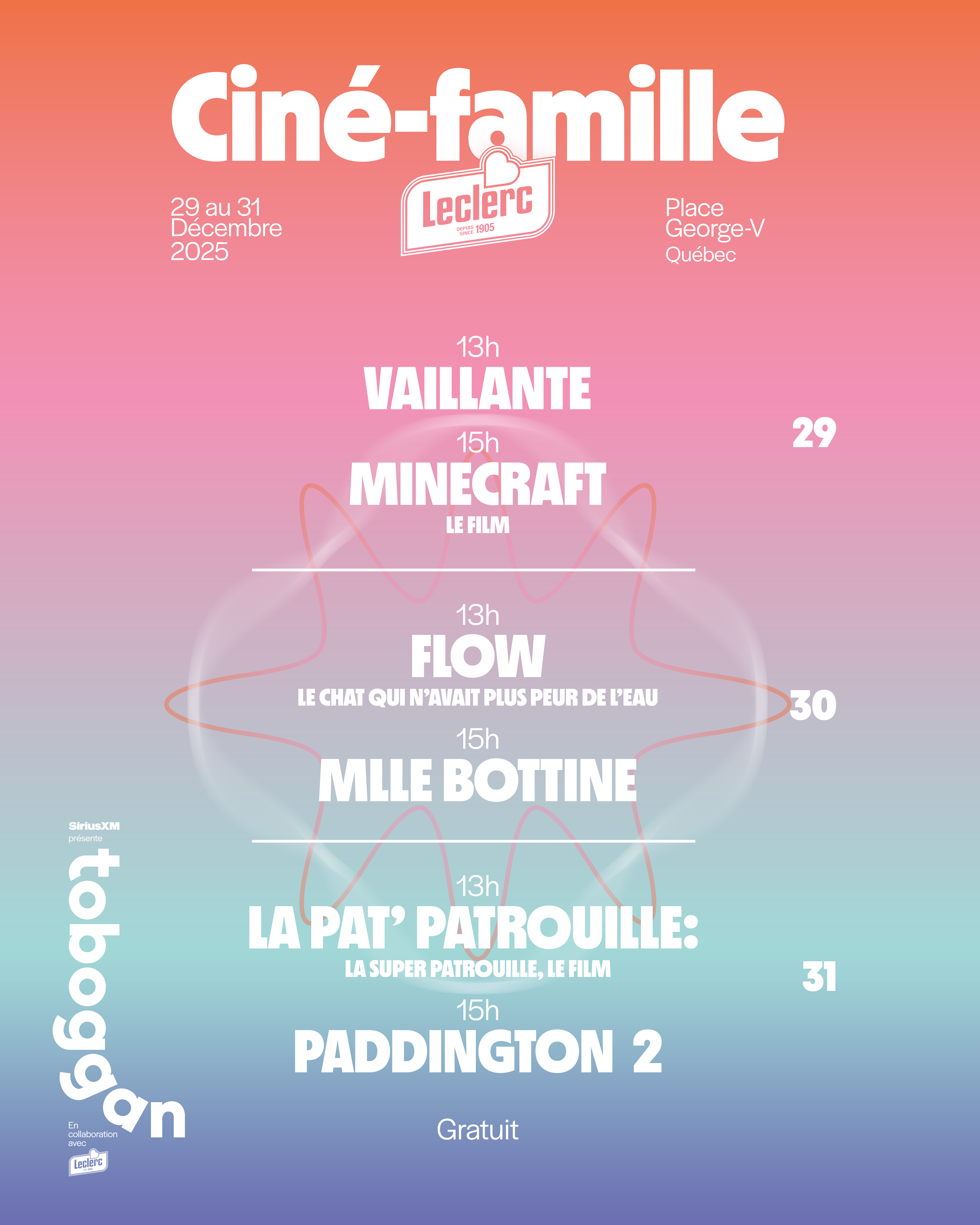 Durant les trois jours de l’événement, de 13 h à 17 h, le Ciné-Famille Leclerc animera la place avec la projection de grands classiques du temps des Fêtes sur écran géant.